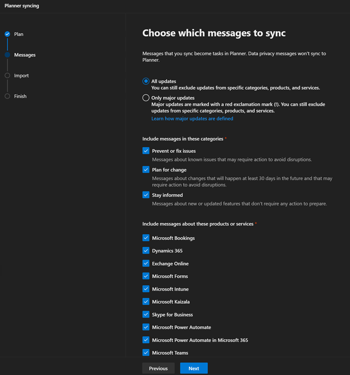 When you setup the Message Center integration with Planner, you can choose which type of message (Information, Plan for change) are being synchronized.