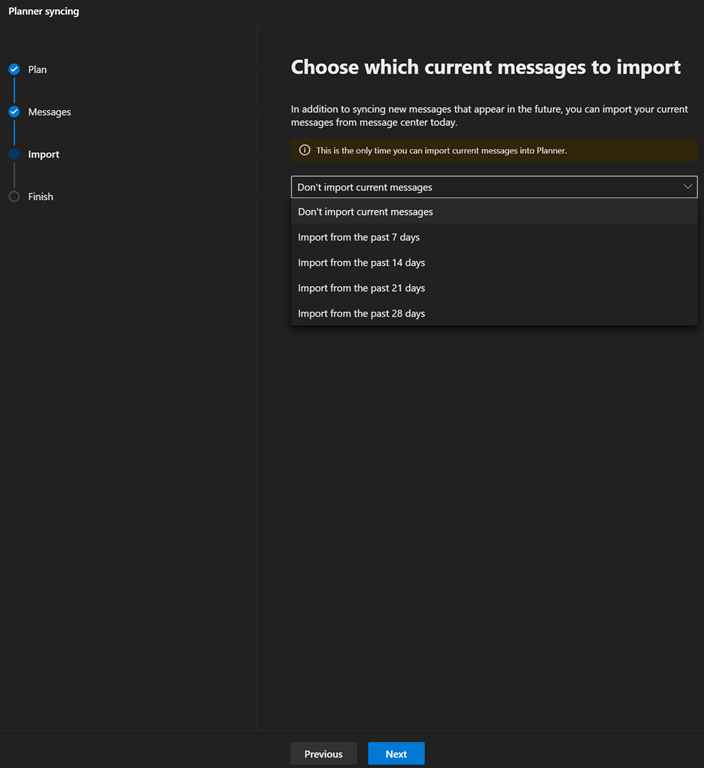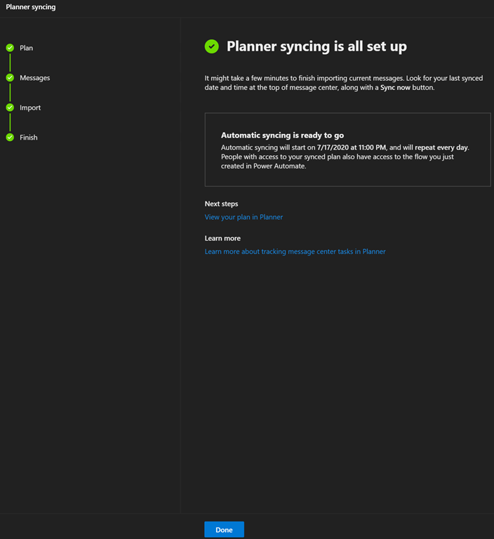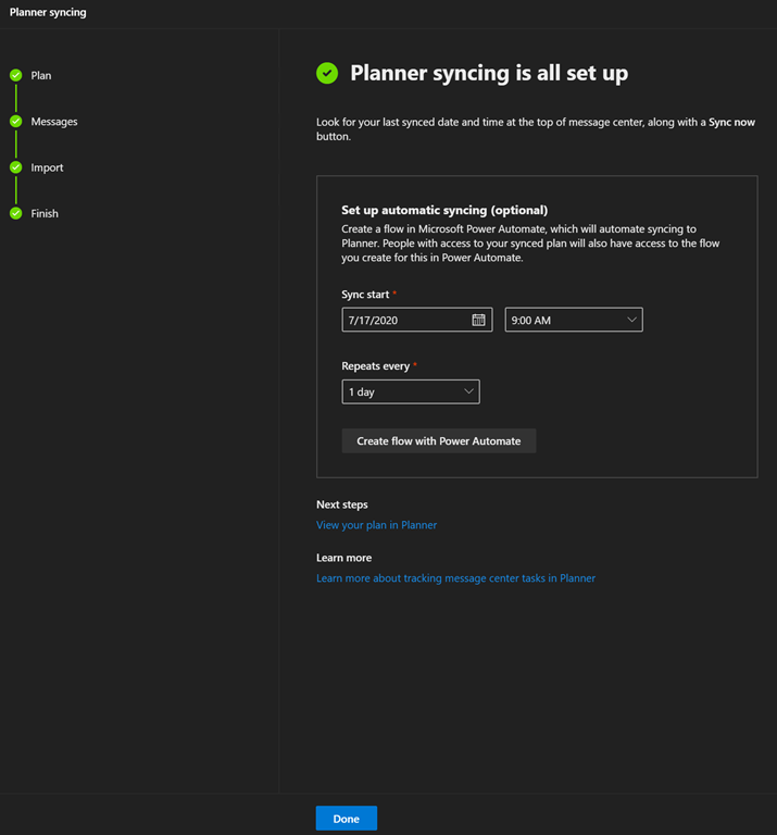 Once the initial synchronization has been triggered, you can then define a schedule to automatically import future messages to Planner.