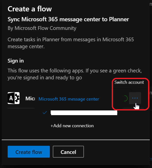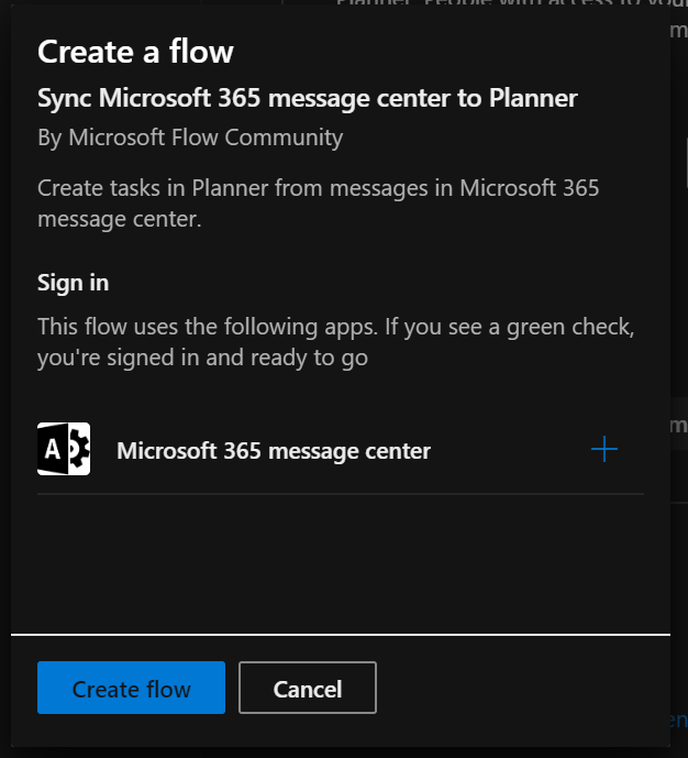 Sync Microsoft 365 message center to Planner)– you may have to sign in by clicking the + (plus) sign. If you see a green tick you are good to go for the creation of the automation