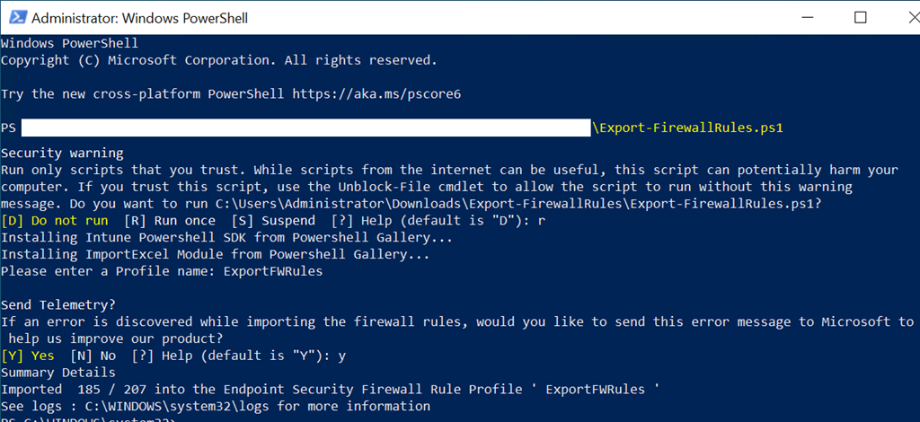 Once completed the migration tool will output the rules that were not automatically migrated and you can access the Intune/Endpoint Configuration Manager firewall profile from the Endpoint Configuration Manager portal (https://endpoint.microsoft.com/) under the Endpoint security\Firewall blade to then deploy the profile(s) to your devices