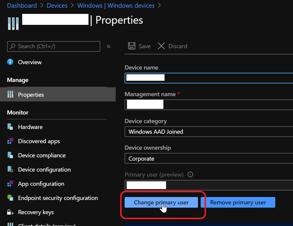 Then go to the Properties of the device blade and use the Change primary user option and select the new primary user