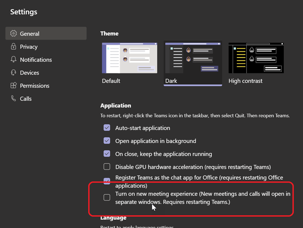 The first things will be to turn on the new experience and then restart your Windows Teams client.