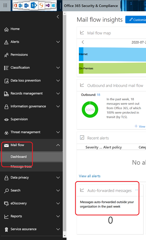 First to start identifying if automatic forwarding email is in use you can use the Auto-Forwarded message report available from the Security dashboard.