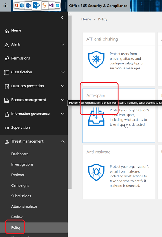 Once you have identified the usage, you can now adjust the antispam policy (either by editing the default policy or editing the custom one you are using) by accessing the Threat Management\Policy blade