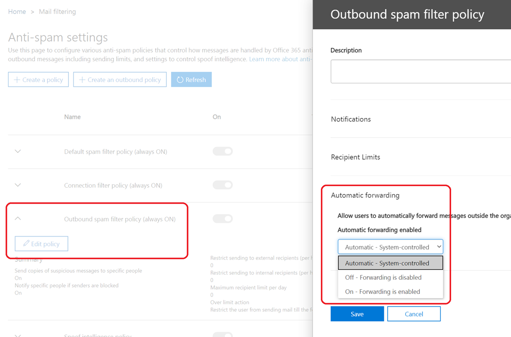 The option to control automatic forwarding email is available under the Outbound spam filter policy