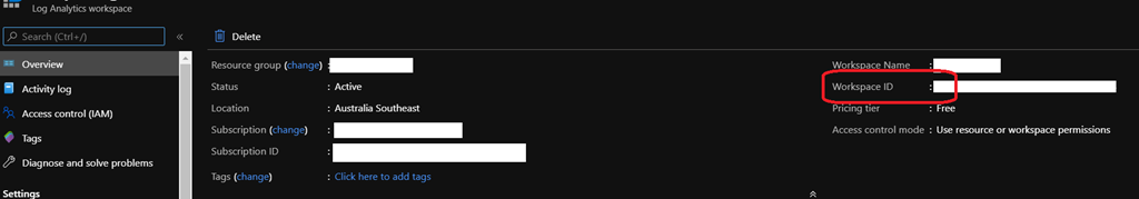 Once you have identified the Log Analytics access the Overview tab to get the workspace ID