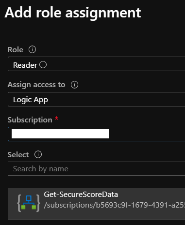 Then you need to assign Reader access to either the subscription(s) (recommended) and/or resource groups you want to include in the report to the Logic App created above (Get-SecureScoreData)