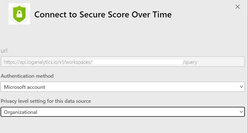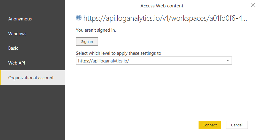 It will then start loading the data and request you to authenticate with an account with permission to access the workspace; use the Organizational Account authentication option and use the OAuth2 method