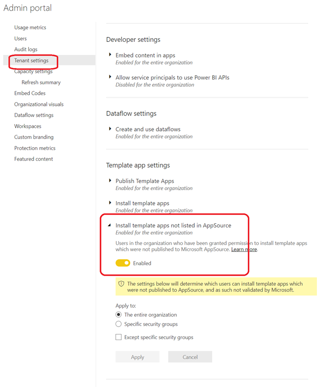 You will need to allow to Install templates app not listed in AppSource; to do it connect with an administrator account to your PowerBI https://app.powerbi.com/ and access the Admin portal to update the Tenant Settings