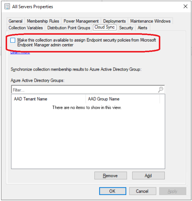 Then you need to go back to the Assets and Compliance workspace to enable Device collection(s) synchronization to the Endpoint Manager portal using the Make this collection available to assign Endpoint security policies from Microsoft Endpoint Manager admin center option available under the Cloud Sync tab