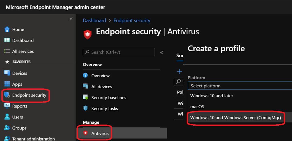 Now you can connect to your Endpoint Configuration Manager portal (https://endpoint.microsoft.com/) to create a Windows 10 and Windows Server (ConfigMgr) profile for Microsoft Defender Antivirus from the Endpoint Security\Antivirus blade and configure the options to manage Microsoft Defender