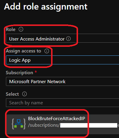Now you need to grant the BlockBruteForceAttackedIP Logic App either User Access Administrator or Owner for the subscription(s), group management or resource group to scope your usage (scope of your Azure Security Center protection)
