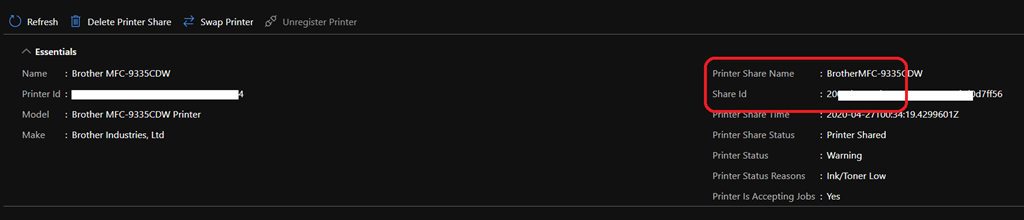 You will need to gather the printer Share ID and Share Name by accessing the Universal Print blade and then the printer properties
