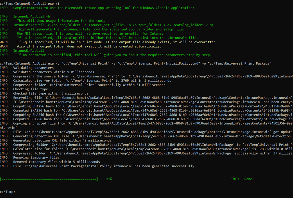 IntuneWinAppUtil.exe -c “c:\Temp\Universal Print” -s “c:\Temp\Universal Print\InstallPolicy.cmd” -o “c:\Temp\Universal Print Package”