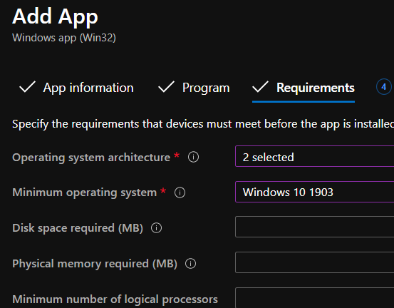 - Select both 32 bit and 64 bit with Windows 1903 as minimum version