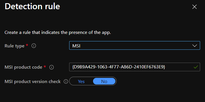 - You need to define the Detection Rule using MSI, the MSI product code should be automatically set