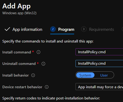 - Set the install/uninstall commands with InstallPolicy.cmd