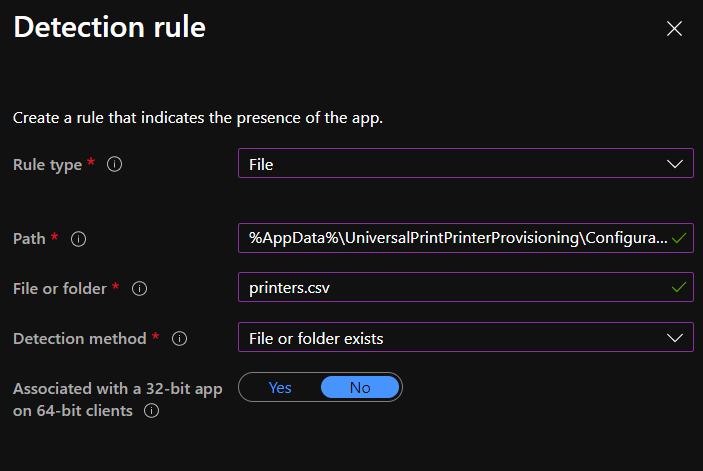 - Define the Detection Rule with a manual rule to detect if the printers.csv file exists in %AppData%\UniversalPrintPrinterProvisioning\Configuration