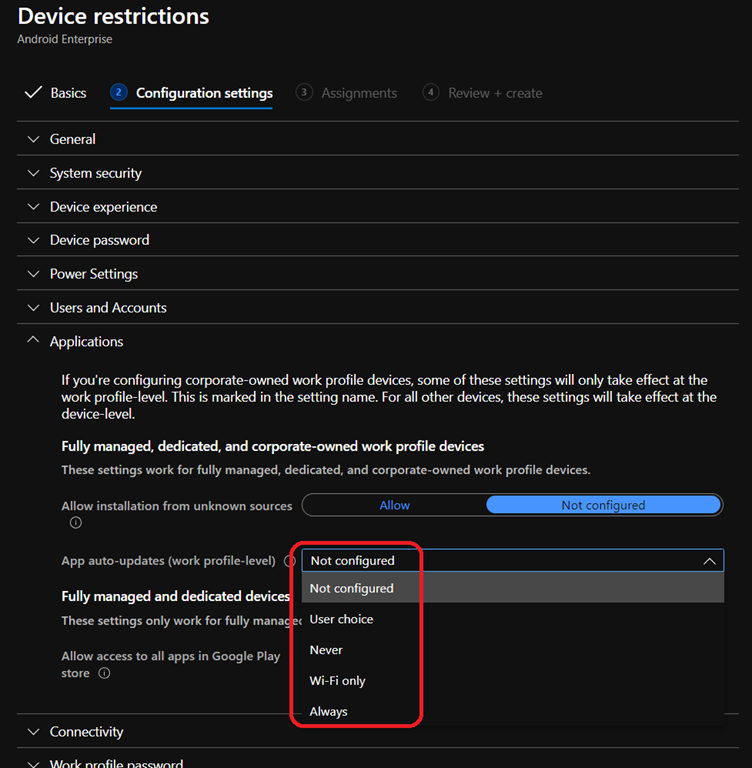 Well, administrators can now also define the application update settings (user choice, never, using Wi-Fi only or Always).