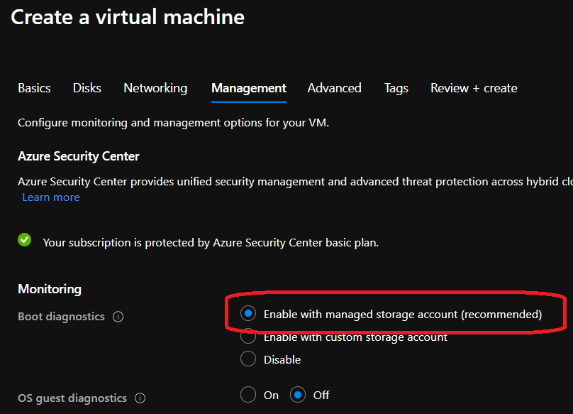 This option will get Azure to create the storage account for you while enabling the boot diagnostics; this results in a simpler and quicker way to get it done.