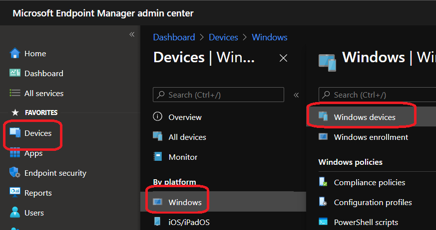 Then you can connect to your Endpoint Configuration Manager portal (https://endpoint.microsoft.com/) to access the Devices\Windows\Windows Devices blade