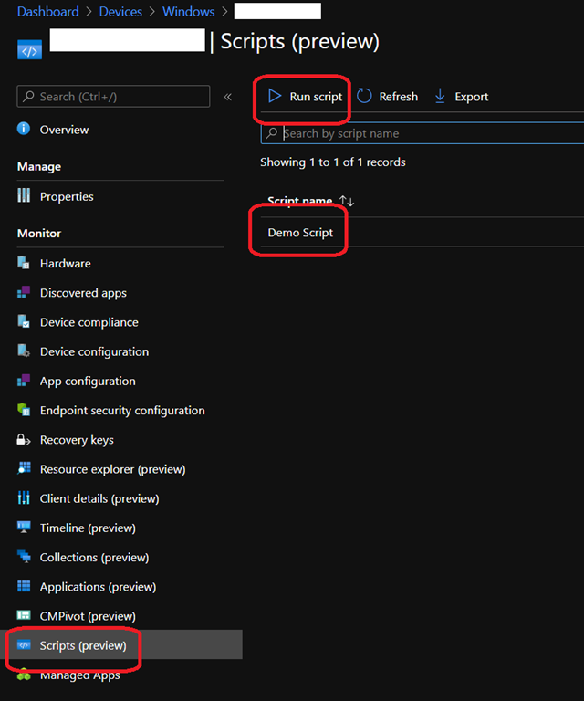 Then select the device on which you want to get the script executed and access the Scripts blade to select the script to run