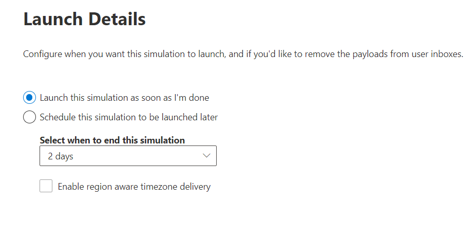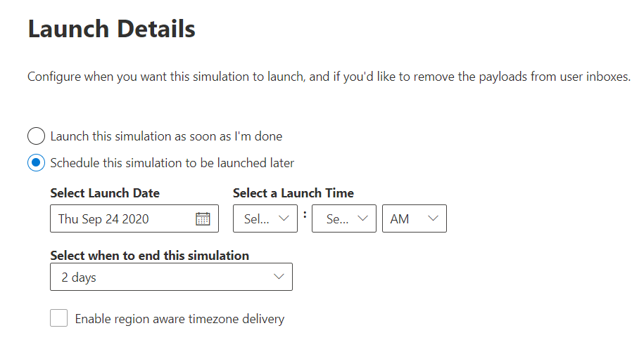 Finally you can defined when the simulation will be launched – either immediately after the completion or at a schedule time with the end time when the simulation will be ended and all ‘unused’ payloads will be removed from user’s mailbox