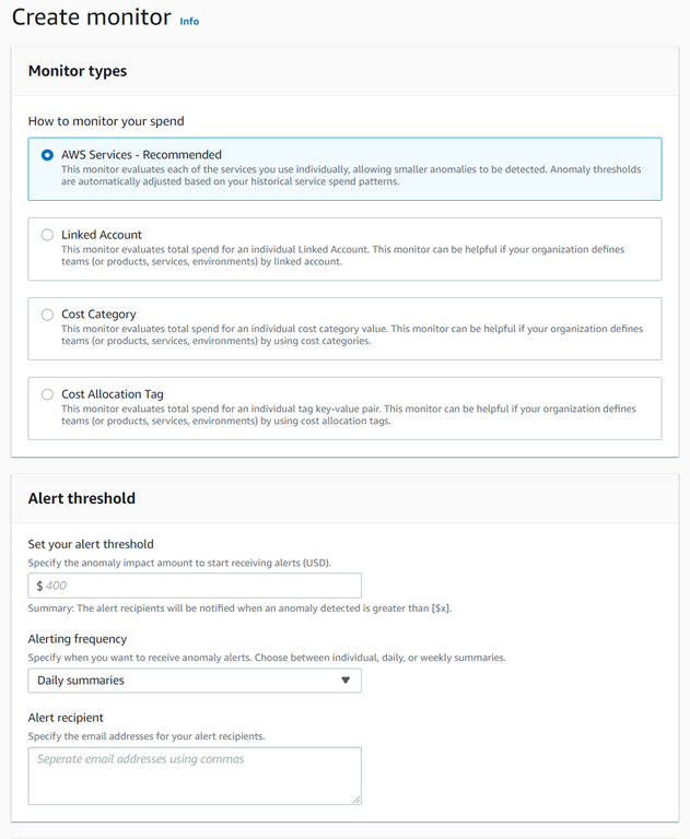 - AWS Services – Recommended for customers that do not need to segment spend by internal organization or environment. This single monitor evaluates AWS services individually for anomalies. As new AWS services are adopted, this monitor will automatically start to evaluate that service for anomalies, without you having to change your configuration