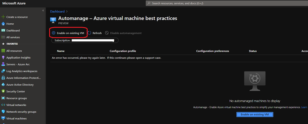 As this the first time you are setting up it, there is probably no virtual machines configured for automanage; you will have to click on Enable on existing VM to start setting up your VM’s for automanage