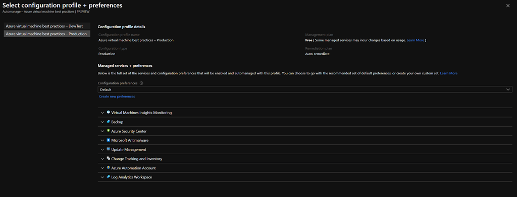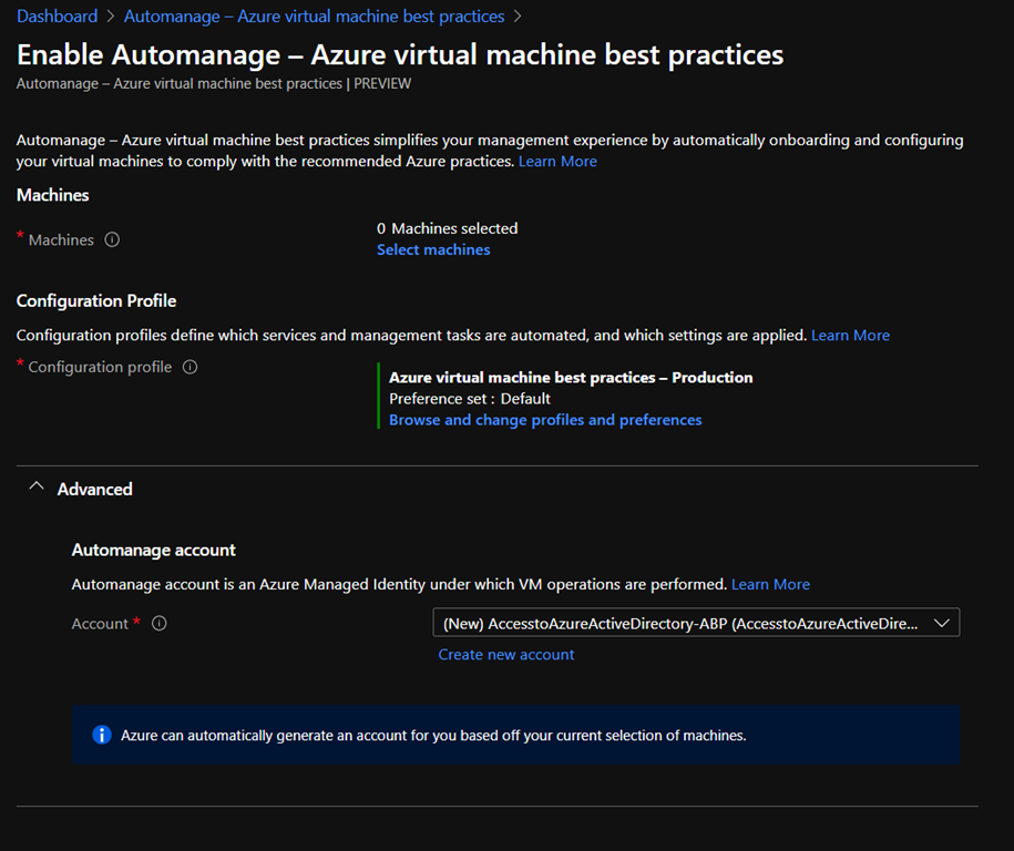 There you will be able to select virtual machine to be enabled for automanage (they must be in running state) as well the configuration profile to apply.