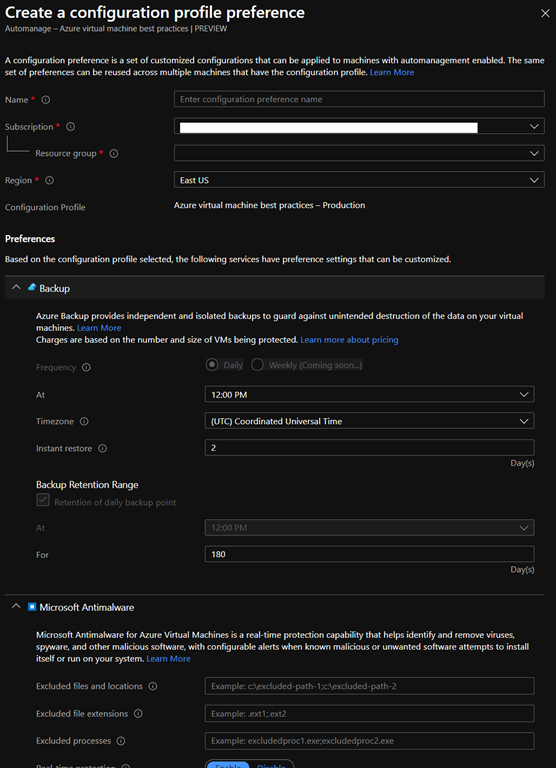 Azure Automanage will automatically implements VM management best practices as defined in the Azure Cloud Adoption Framework.
