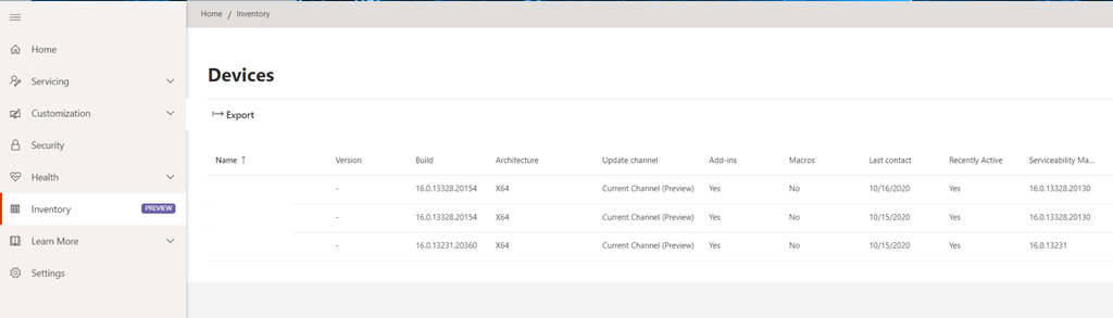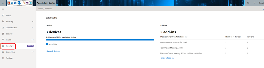 Then you can start having an overview of the current state of your Office installations, including add-ins using the Inventory blade