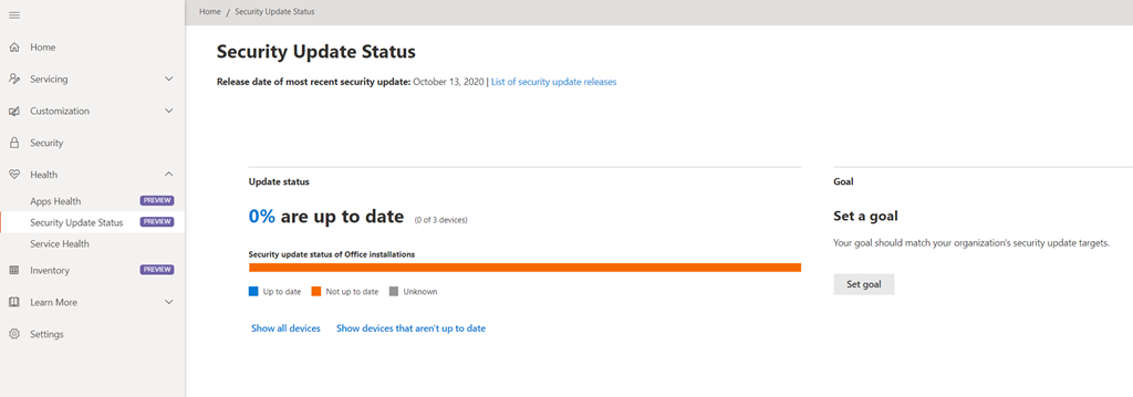 If you use the Security Update status you will have the overview of the update level of your environment; I’m not quite sure if this is because my Office installations are Insider or if there is some additional delay but the report here is not accurate.