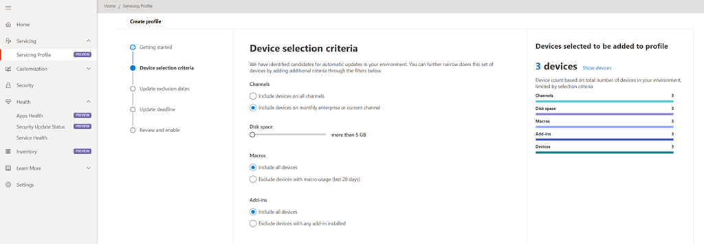 Then finally, using the Servicing Profile blade you can define different update profiles for your installation to exclude/include specific installation type to manage their updates settings