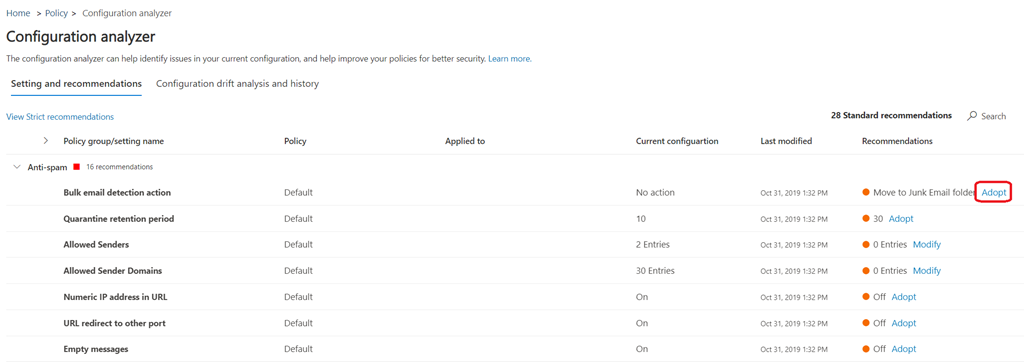 You can then review the recommendations for each section and if required choose to update your policy using the Adopt button