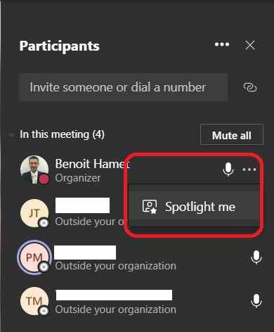 When you are on a Teams meeting and participants have turned on their camera, you can now spotlight a specific video stream to all meeting participant – this also works even if the participant did not turned on the camera (but what’s the point).