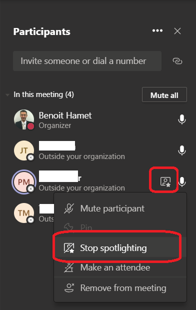 To spotlight a participant, open the contextual menu of the participant to choose spotlight