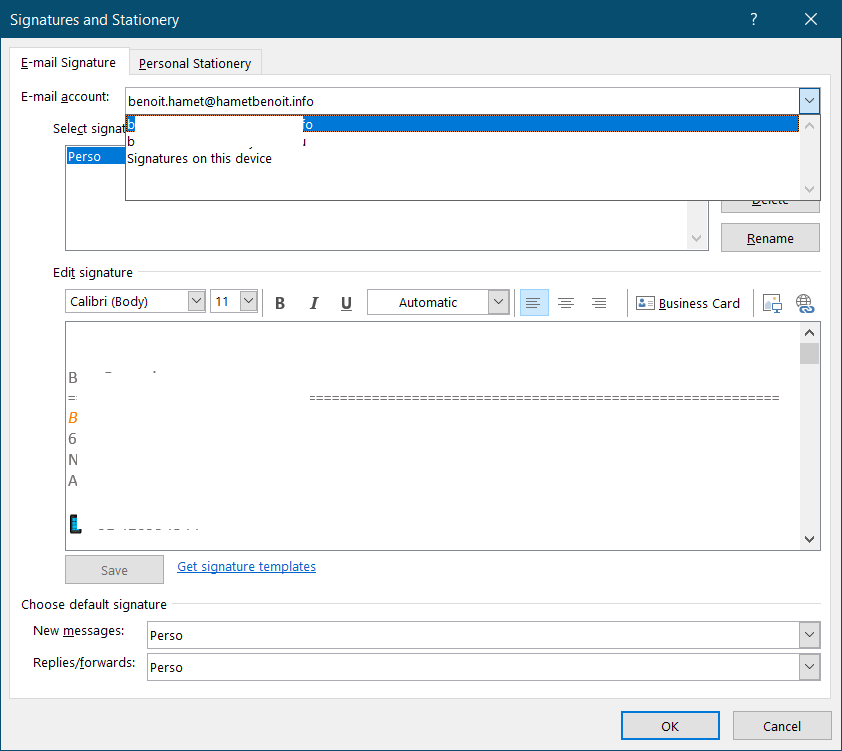 Now, once you got the appropriate version of Outlook (mine is set to Office Insider so please be patient if you don’t see it yet – it is expected to be available in late November), the interface will let you define the signature to use, either the roamed one or on the device