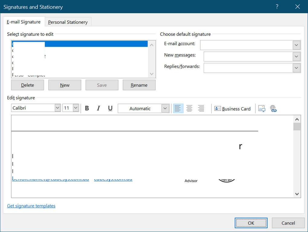 NOTE if you are using a third party signature solution (like Exclaimer), you must not use the feature (switch the option to Signature on this device). If you are in this situation, your administrator can deploy a specific registry key to block the roaming signature feature.