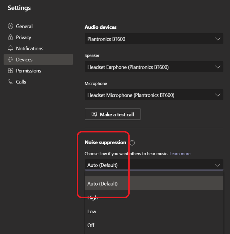 - Auto (default and I would say recommended) The Teams client decides on the best level of noise suppression based on local noise