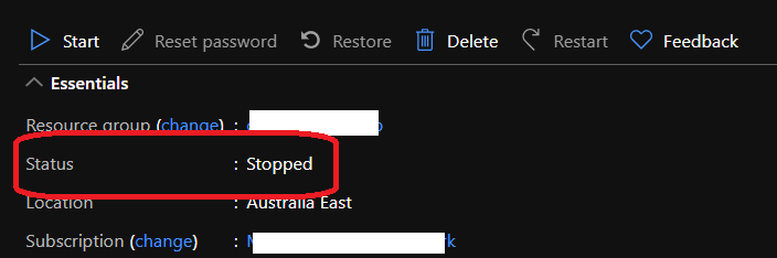 You can view the status of the server from the Overview blade thanks to the Status field