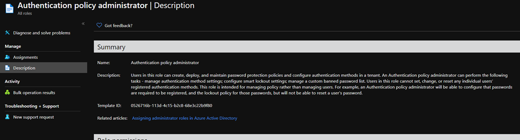 A new role called Authentication Policy Admin allows you to delegate authentication methods management, covering MFA or password protection policies.