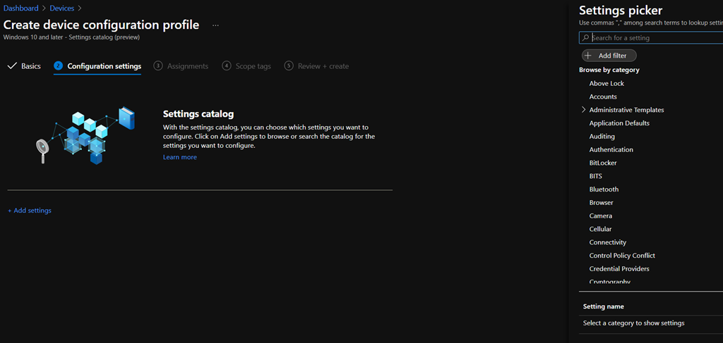 - Settings catalog (currently in previw); this is a new capability letting you configure in a more simplified way device settings. This allows you to search for specific settings and configure all of them in one place
