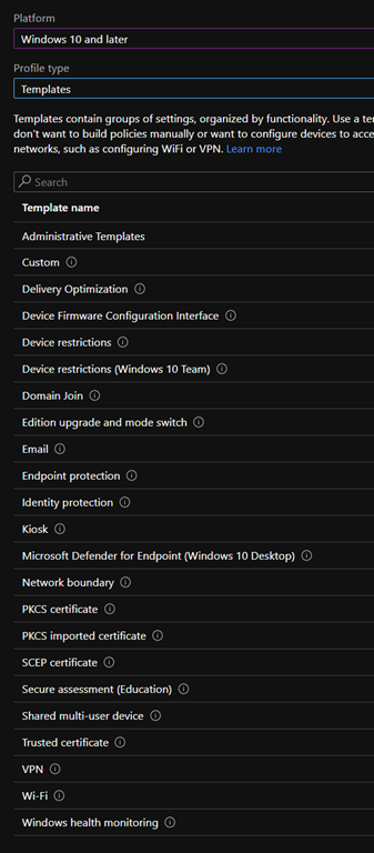 - Templates; this is the option to use if you want to create device configuration profile based on the same previous type we had (Device feature, Device restriction…)