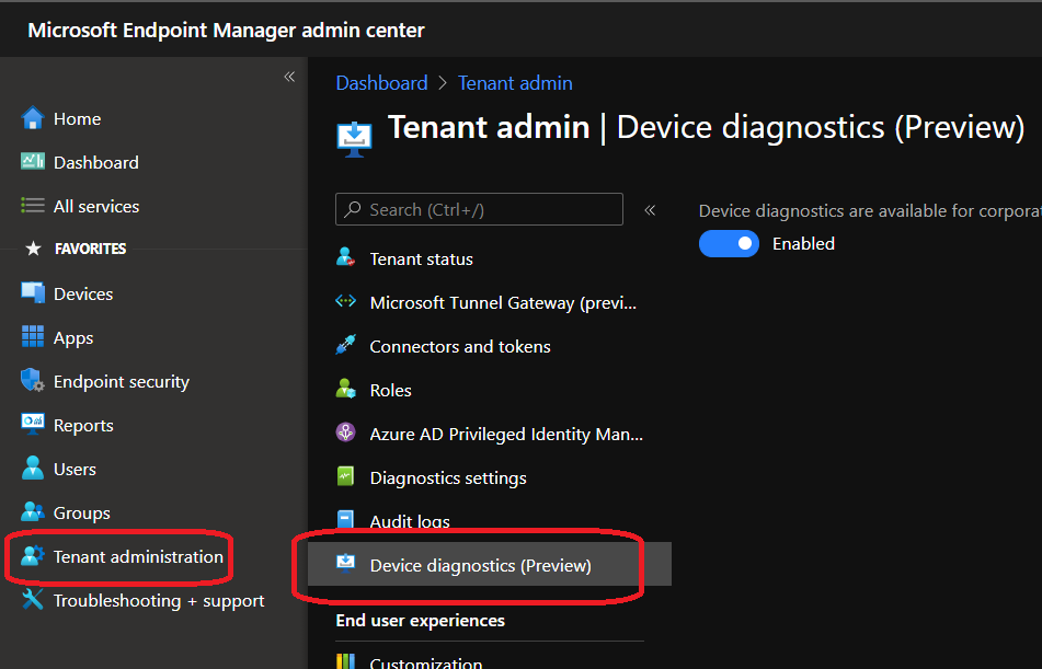 Now if the prerequisites are met, you can logon to your Intune/Endpoint Configuration Manager portal (https://endpoint.microsoft.com/) using either a Global Admin, Intune Admin, School Admin, Helpdesk Operator account (or any custom role which has Collect Diagnostic permission).