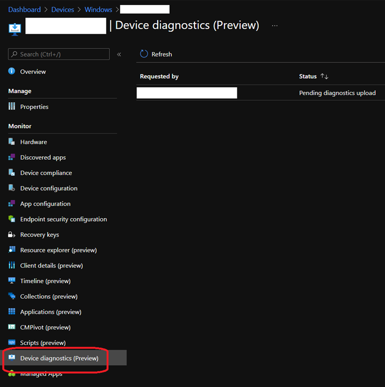 - Pending diagnostics Upload: The device is running the diagnostics and will finish shortly, or the device is offline/unreachable and has not received the request. The diagnostics task is good for 12 hours, so if the machine comes online and/or checks into the Intune service, the diagnostic action will be kicked off.