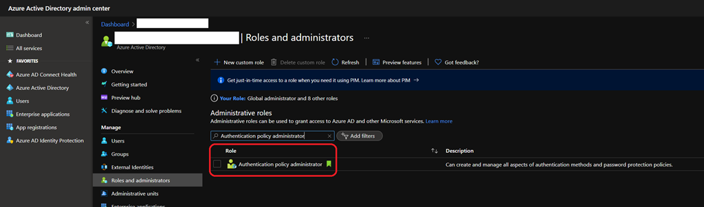 - Authentication policy administrator to delegate the permissions to manage the authentication methods enabled on Azure AD and associated tasks (multi factor authentication and password policy)
