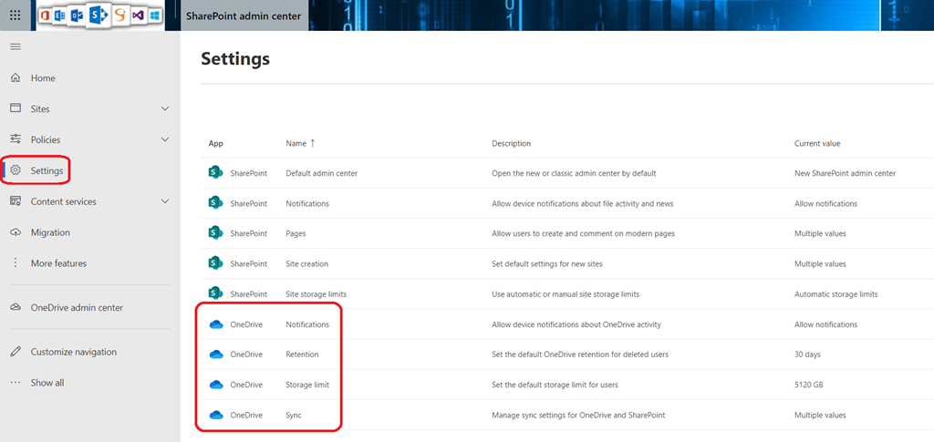 1. OneDrive Sync, Storage and Notification settings will be moved to the SharePoint Online administration portal under the Settings section