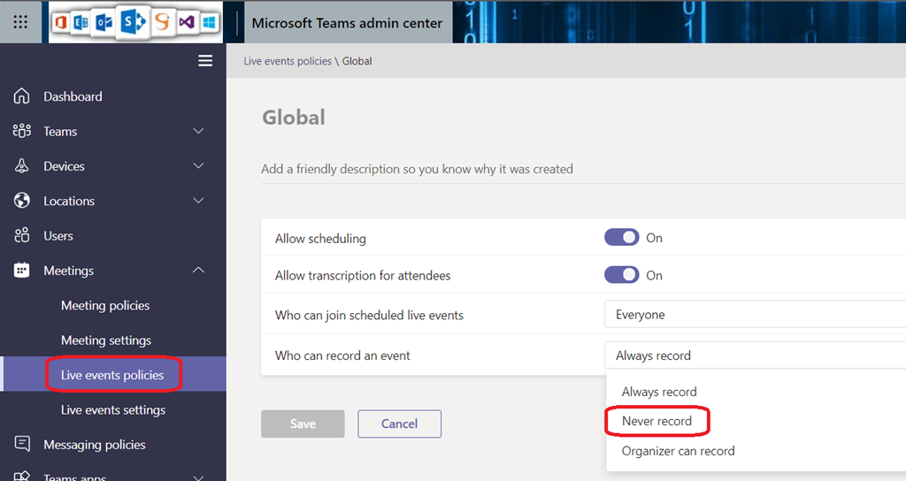 To set the policy to never record a Live Event, connect to your Teams administration portal (https://admin.teams.microsoft.com/) and reach the Meetings\Live event policies configuration blade to edit the policy you want to edit the Who can record and event setting
