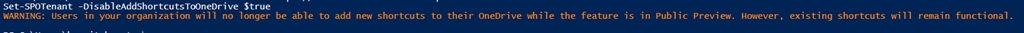 Set-SPOTenant -DisableAddShortcutsToOneDrive $true